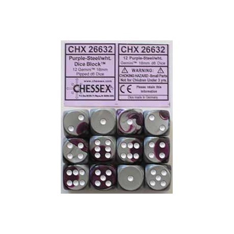 Gemini Purple-Steel/white 16mm d6 Dice Block (12 dice) CHX26632